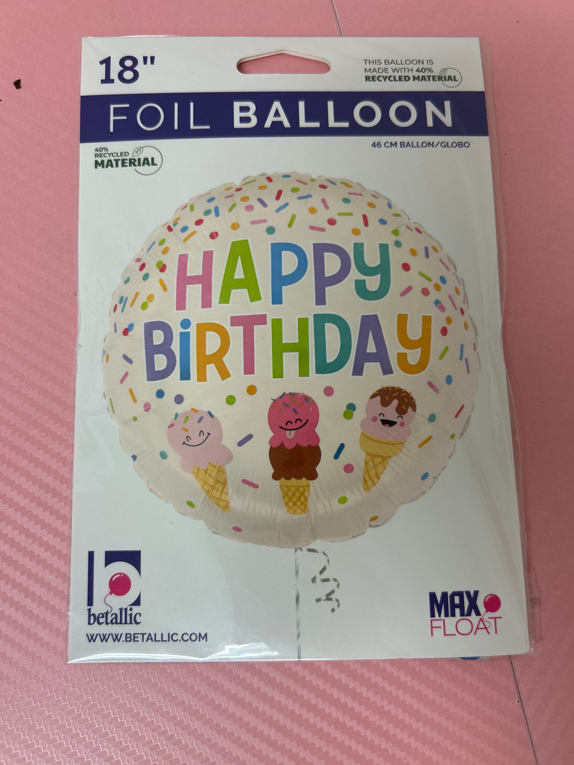 Celebrate birthdays with this vibrant 18" foil balloon featuring a cheerful "Happy Birthday" message and colorful ice cream cone designs. Made from 40% recycled material, it's an eco-friendly choice for any festive occasion. Its MAXFLOAT technology ensures longer-lasting inflation, perfect for creating a joyful party atmosphere.